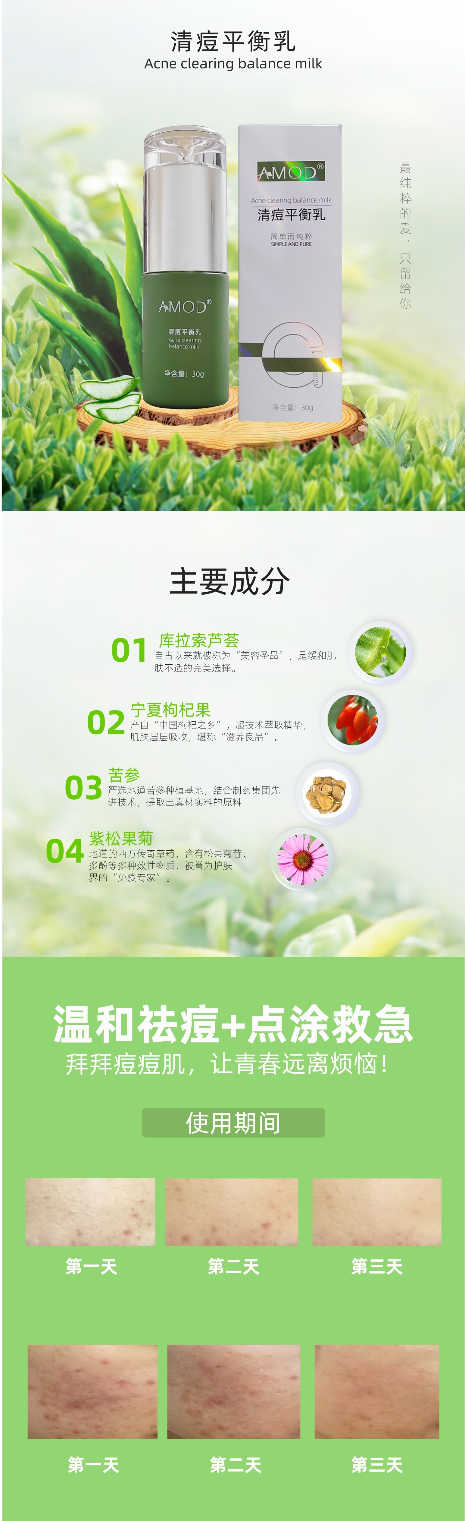 本次推出新品AMOD清痘平衡乳,系国源国药集团旗下一个专门解决肌肤问题的品牌,简单而纯粹,温和祛痘+点涂救急,拜拜痘痘肌,让青春远离烦恼!